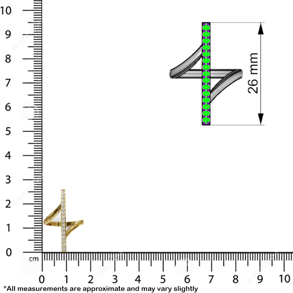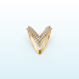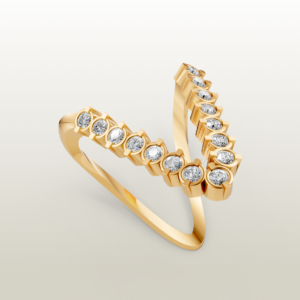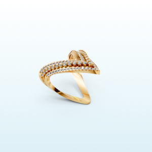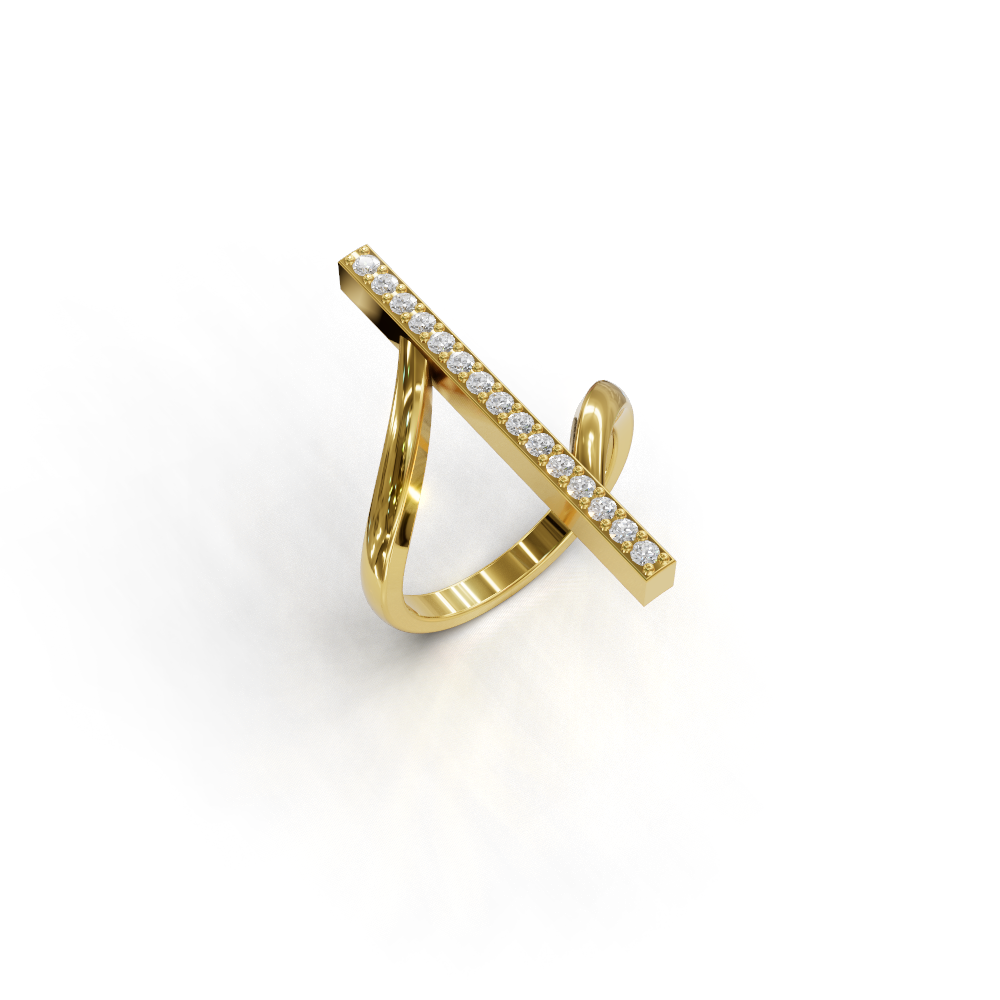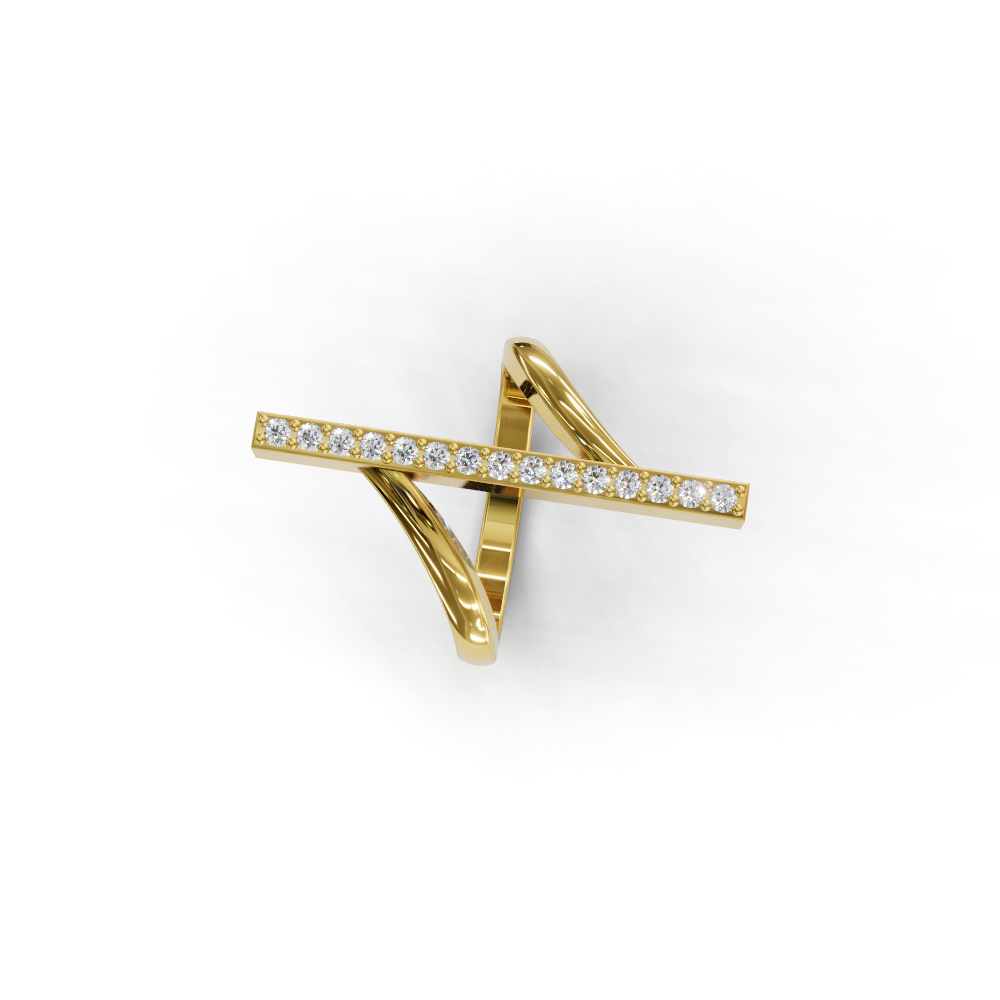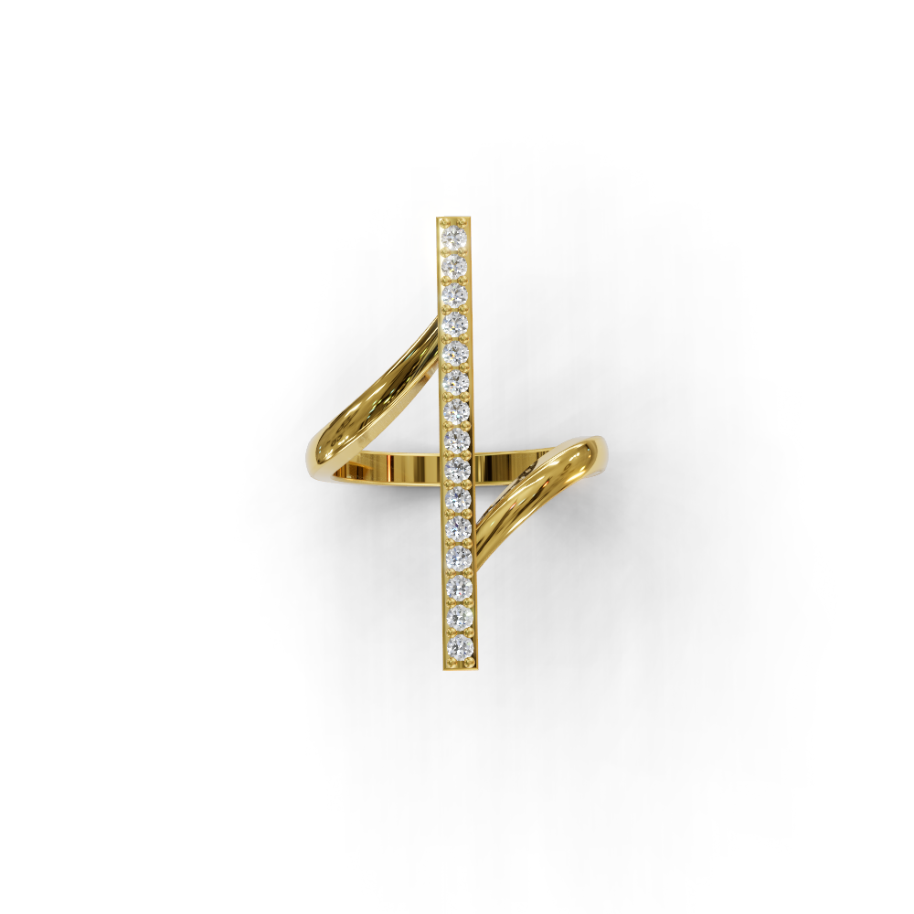 This modern and artistic ring features a sleek, vertical line of 16 sparkling diamonds set in a warm, lustrous gold band. The innovative open-loop design creates a graceful, flowing form that adds a sculptural element to the piece. The vertical diamond setting beautifully contrasts with the curved band, giving it an avant-garde yet elegant appearance. This ring is perfect for those who appreciate contemporary jewelry with a bold, refined twist.