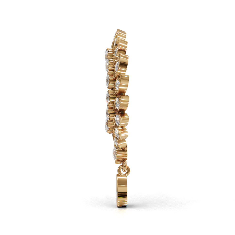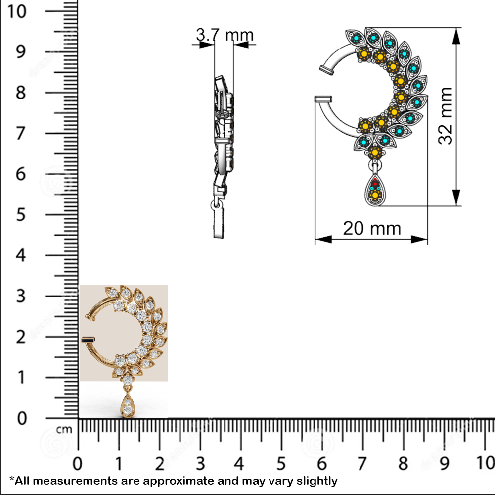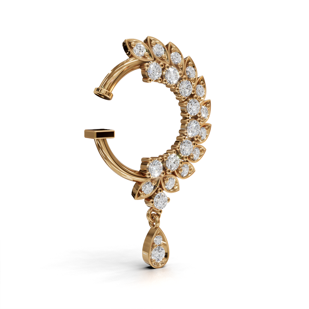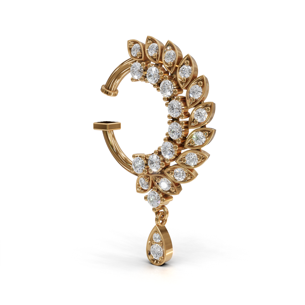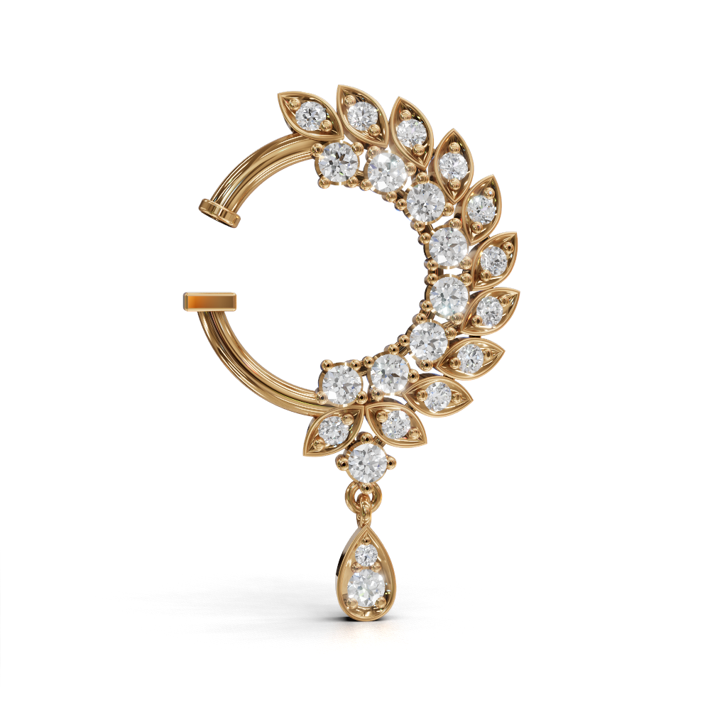 Nose pin features a crescent-shaped golden base adorned with brilliant marquise and round-cut white diamonds arranged in a sunburst pattern.
