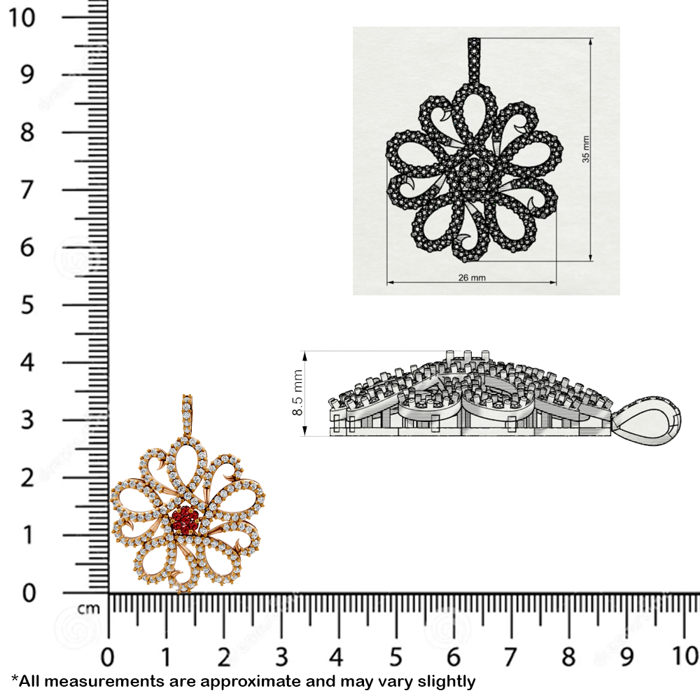 This exquisite pendant showcases an intricate floral design, crafted with delicate loops of sparkling white diamonds that form a captivating, lace-like pattern. At the heart of the piece lies a radiant cluster of vivid red gemstones, adding a bold and vibrant focal point that contrasts beautifully with the brilliance of the diamonds.