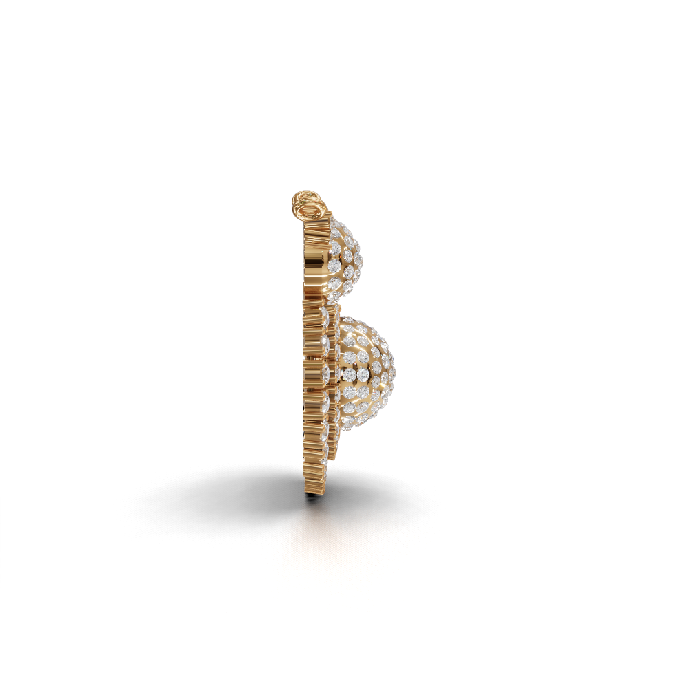 Showcasing an intricate and elegant circular design. The central focus features domed, globe-like elements encrusted with sparkling diamonds, giving it a radiant and luxurious appearance. Surrounding the centerpiece are layered rings of meticulously set diamonds, creating a mesmerizing, symmetrical pattern that enhances the brilliance and depth of the design